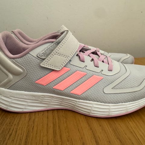 Adidas München joggesko for jente i størrelse 38. Skoene er rosa og laget i semsket skinn med tekstildetaljer. De har klassisk Adidas design med tre hvite striper på siden og logo på hælen. Passer til hverdagsbruk.