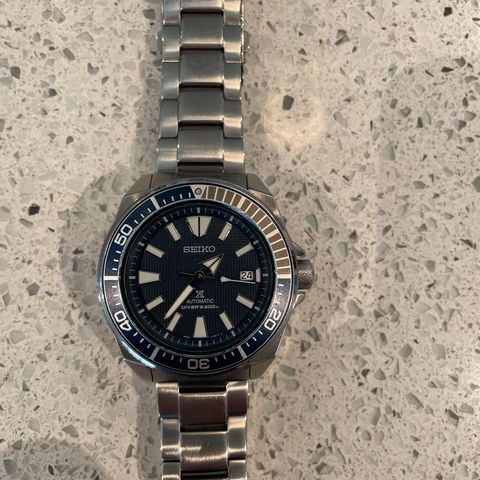 Seiko SNZF17K1 automatisk herreklokke med stål lenke. Klokken har svart urskive med rød og blå bezel. Populært kalt «Sea Urchin».