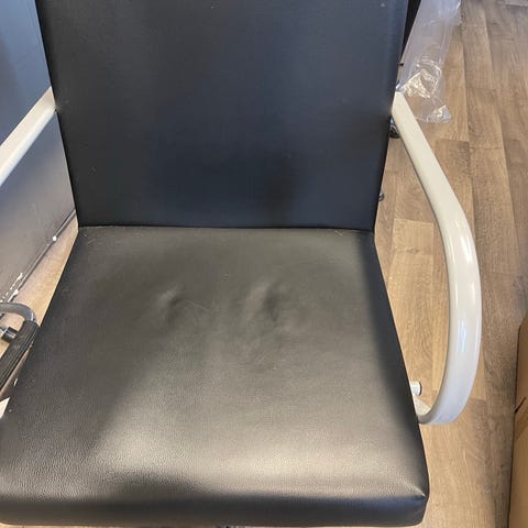 Frisørstol med pumpe, ben hvile og kan roteres.