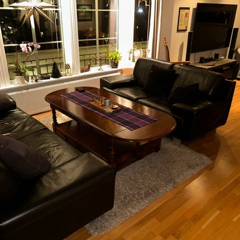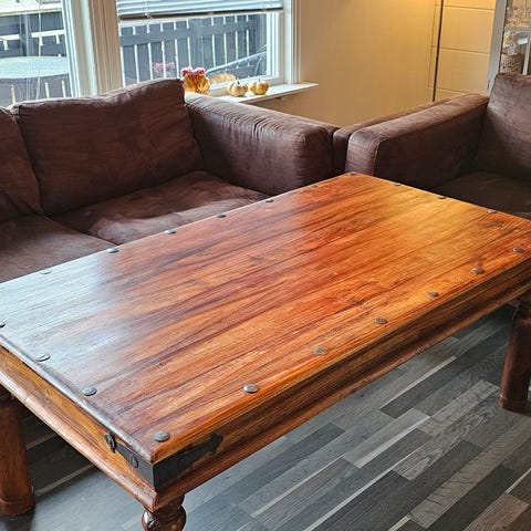 En treseter med to stoler i skinn + et bord. pent brukte møbler, har ikke vært i dagelig bruk.