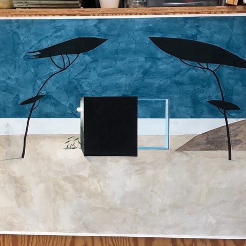 Abstrakt maleri med farger i gult, grått og svart. Maleriet har en teksturert overflate og viser et mønster av overlappende former og linjer. Passer til dekorasjon i ulike rom.