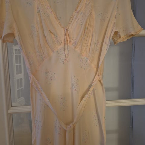 Nydelig vintage nattkjole / huskjole i kremhvit med små prikker. Klassisk og feminin modell med smock-brodert bryst, små blomsterdetaljer og knapper hele veien.