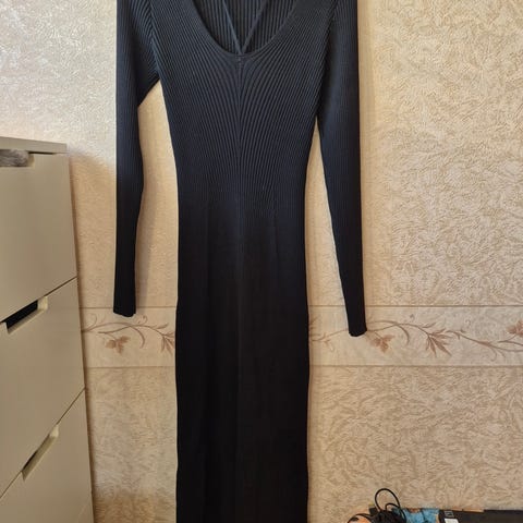 Elegant og behagelig kjole i myk, ribbestrikket kvalitet med klassiske detaljer. Den har krage, knappestolpe med tre dekorative gullknapper og lange ermer. Passformen er rett og flatterende, og stoffet gir både komfort og stil.
