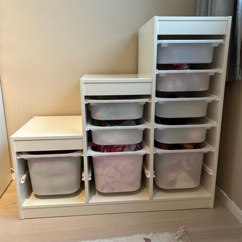 Ikea trofast stamme i hvit. Klistret fast bilbane på toppen. Tror ikke det går ann å ta av uten at det blir merker. Godt brukt, mye bruksmerker! Selges derfor billig! Er kun stamme som selges. Boksene selges ikke.