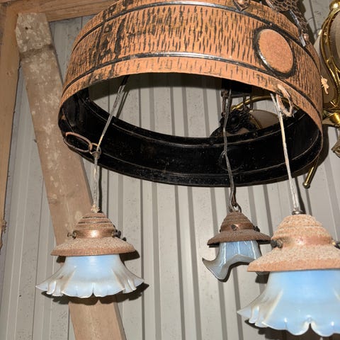 Gammel lysekrone i tre med utskjæringer. Nyere lampeskjermer i god stand følger med men kan evt. byttes.