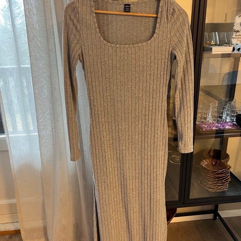 Lang, elegant kjole med ribbestrikket struktur og flatterende passform. Kjolen har tettsittende overdel og utsvingt skjørt, som gir en feminin silhuett. Laget i mykt og miljøvennlig TENCEL™ Lyocell-blanding, som føles behagelig mot huden og har et naturlig fall.