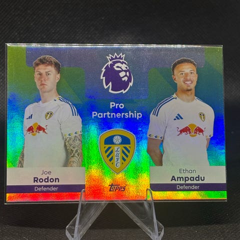 Topps Premier League Pro Partnership fotballkort med Joe Rodon og Ethan Ampadu. Kortet viser begge spillerne i Leeds United-drakter og inkluderer informasjon om deres posisjoner som forsvarsspillere. Sesong 2025/26.