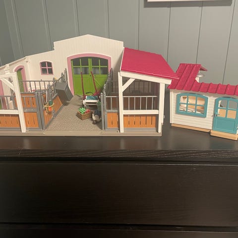 Schleich dukkehus med to etasjer. Inne i huset finnes møbler som bord, stoler, senger og kjøkkenutstyr. Det er også staller og mange ekstra hester og utstyr. Bil med hestehenger og hest. Alt på bildene selges samlet.