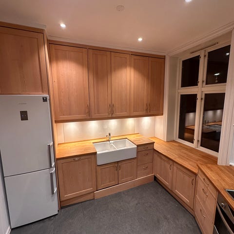 Passer til et lite kjøkken, eller et vaskerom. Kjøkkenet har kun vært brukt til utstilling.