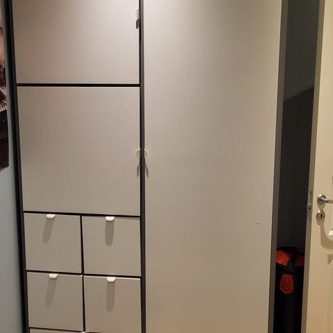 Har stått på samme sted. Ingen bruksmerker synlig på utsiden. Det ene hjulet har falt av men kan festes igjen. Jeg har ikke gjort det grunnet flytting og travelt. De store skuffene har noen "voks" flekker inne i, og disse kan fjernes.