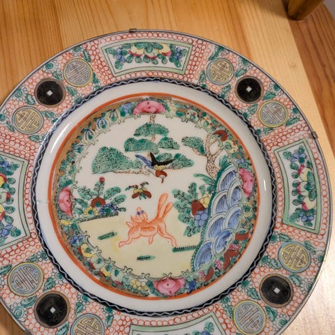 Rundt Satsuma-fat i samme stil og periode, med variert figur- og landskapsdekor. Harmonisk fargebruk, god dybde i maleriet og gjennomgående høy utførelseskvalitet. Et sterkt selvstendig objekt, eller et naturlig supplement til det større fatet.