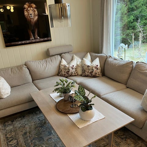 Sofa stoffet er i beige ullstoff og er avtagbart.