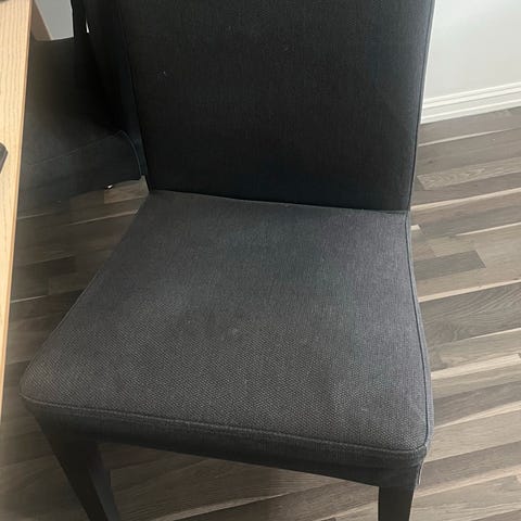 Selger samlet 4 IKEA BERGMUND stoler i farge grå, polstrede stol med høy rygg og hvite ben. Passer til bruk rundt/ rektangel spisebord eller som ekstra sitteplass.
