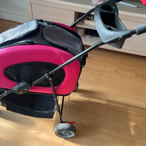 Pet Gear Pet Stroller hundetrille i blå farge. Utstyrt med fire hjul, nettingvinduer for ventilasjon, og koppholdere på håndtaket. Designet for å transportere små hunder komfortabelt og trygt. Kjøpte den impulsivt og har ikke brukt den. Den koster 889kr. Den er fin til hunder og katter.