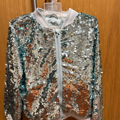 H&M paljetter jakke i rød farge, størrelse 134, designet for jente. Jakken har hel glidelås og er laget med paljetter som materiale.
