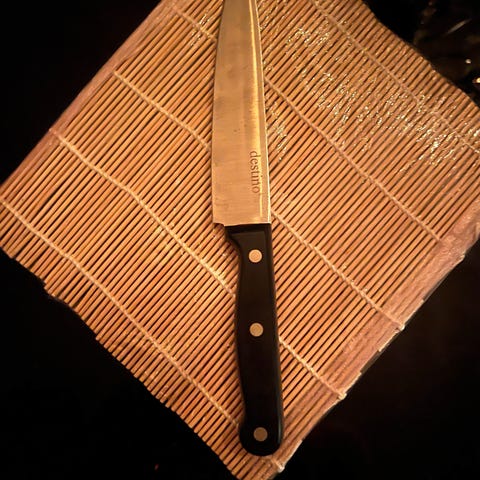 Fiskars file kjøkkenkniv med svart håndtak og metallblad. Egnet for generell bruk i kjøkkenet.