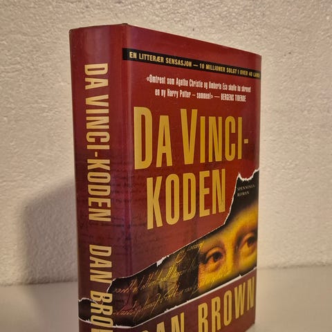 Dan Brown Da Vinci-koden er en innbundet bok med rødt omslag. Boken inneholder en spennende historie som kombinerer mysterier, spenning, historie, vitenskap og kulturell kontekst. Teksten er på norsk.