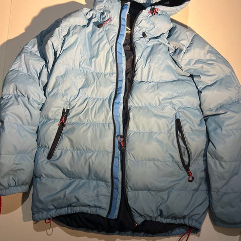 Selger en god og varm dunjakke. Liten skade på arma, men reparasjonstape fikser fint hullet.