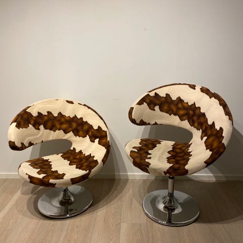 Stoler i brun håndhevd rotting med sorte stålben. Meget komfortabel å sitte i både inne og på overbygd terrasse. Utgått modell i Norge.