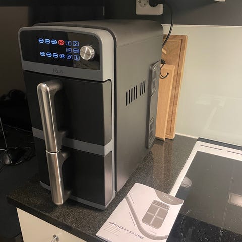 Salter Airfryer i svart og sølv. Egnet for tilberedning av mat ved hjelp av varmluftsteknologi, som gir mulighet for steking med lite eller ingen olje.