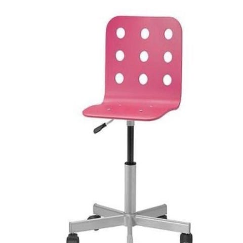 IKEA VIMLUND barnestol i rosa farge. Stolen har hjul og fotstøtte, og er designet for barn.