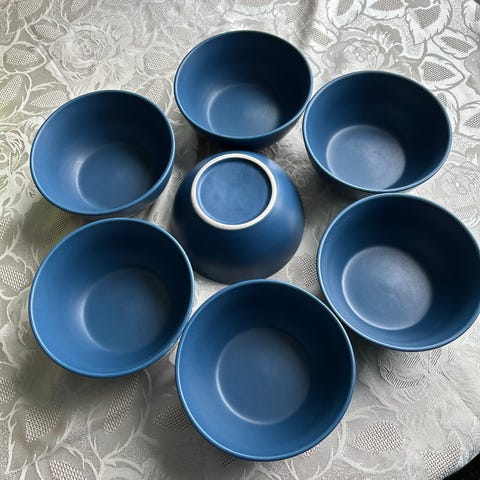 Höganäs frokostskåler 4 stk og eggeglass 3 stk selges samlet kr 400. Intakte. Mellomblå.