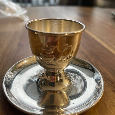830 s sølv eggeglass med tilhørende skål. Skålen er fastmotert. Produktet har dekorative mønster både på selve eggeglasset og på skålen. Fin også som dekorasjon.