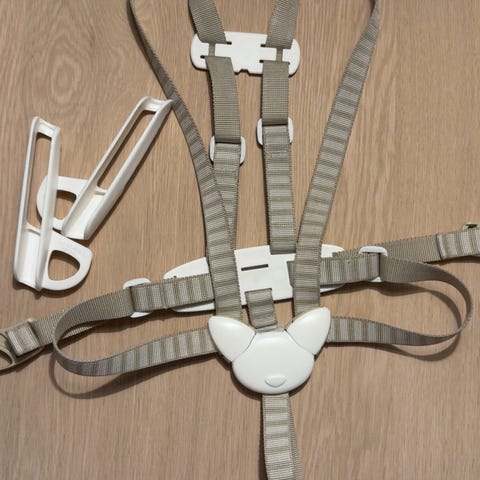 Stokke sikkerhetssele i justerbar størrelse med beige og hvit farge. Laget av slitesterkt materiale, for bruk til Stokke Tripp trapp stol.