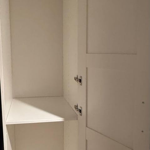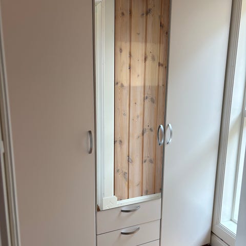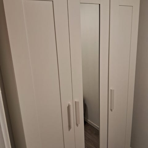 Godt, men pent brukt stødig garderobeskap i tre til salgs. Har stått på samme rom gjennom hele brukstiden. Speil på den ene av to dører. Skapet er delt i to, med stang på ene siden og 5 hyller på andre siden, samt en stor hylle på tvers øverst.
