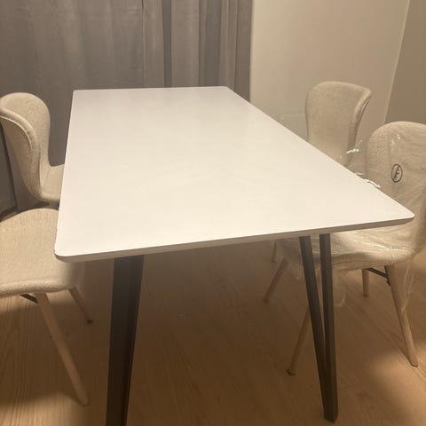 Gir bort spisebord m/to klaffer og fire tilhørende stoler. Bord har noen bruksmerker her og der; men fremstår ellers pent. Bordet er solid og stabilt, og passer fint som kjøkkenbord/spisebord.