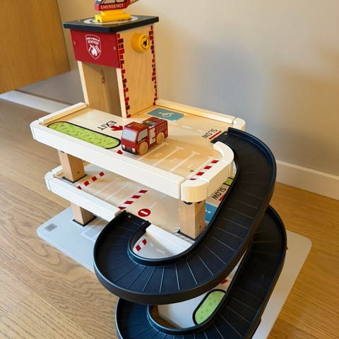 Garasje / Parkeringshus fra Le Toy Van. Med flere etasjer og bilheis. Noen bruksmerker men alt fungerer som det skal. Nypris 1900.