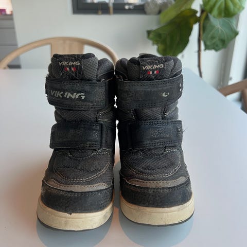 Viking barnesko for unisex i størrelse 26. Skoene har en mørk grå farge med gule detaljer. De har borrelås for enkel justering og påkledning.