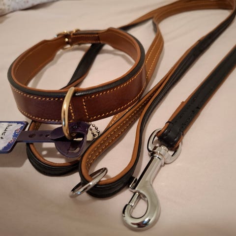 Pelsbarn kobbel hundebånd i brunt materiale med metallspenner. Designet for å brukes som bånd til hunder, med justerbare funksjoner for tilpasning. Helt ny og ubrukt.