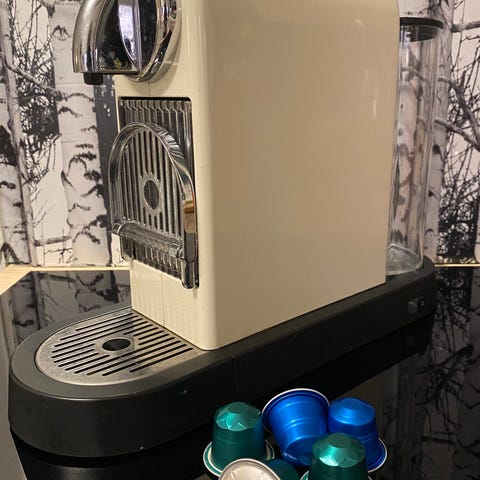 Nespresso Vertuo Plus deluxe kapselmaskin i hvit farge. Maskinen bruker kapsler for å lage kaffe og har en kompakt design. Passer for hjemmebruk eller små kontorer. Medfølger noen kapsler som er forbi best før dato i 2024.