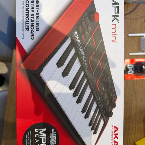 Akai MPK25 MIDI-kontroller med 25 tangenter, flere kontrollknapper og pads for musikkproduksjon. Enheten har USB-tilkobling, MIDI inn- og utganger, samt tilkobling for expression og sustain pedal. Passer for både studio og live-bruk.