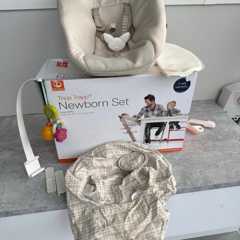 Pent brukt Stokke Tripp trapp Newborn seat. Nyvasket og uten synlige bruksmerker. Følger med lekebøyle og et ekstra trekk med to ulike mønstre.