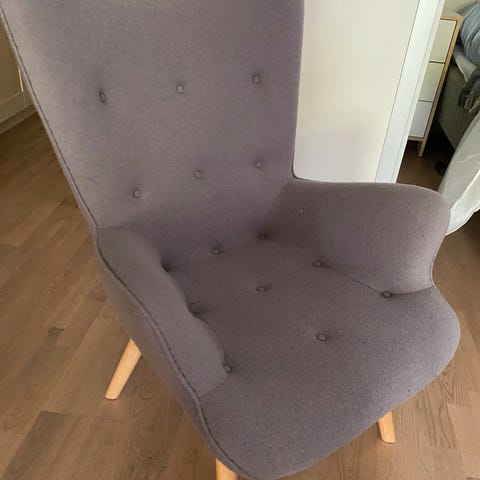 Hel og pen IKEA lenestol i grått stoff med treben. Stolen har høy rygg og polstret sete med pute. Nypris 2995kr.