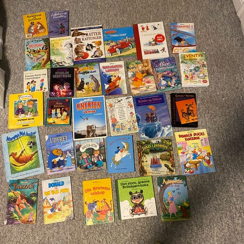 Samling av Disney barnebøker med ulike klassiske historier som Løvenes konge, Mulan, Aladdin, og flere. Bøkene har fargerike omslag og er tilpasset barn.