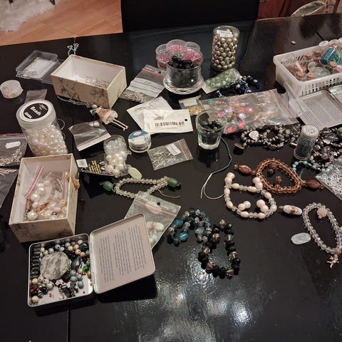 Armbånd med hvite og svarte perler, inkludert dekorative krystall-lignende perler og hjerteanheng med små steiner. Armbåndet har en lås med ring og stang.