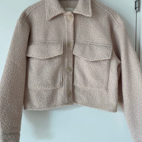 H&M Andre jakker i beige fuskepels, størrelse L for dame. Jakken har glidelås foran og lommer.