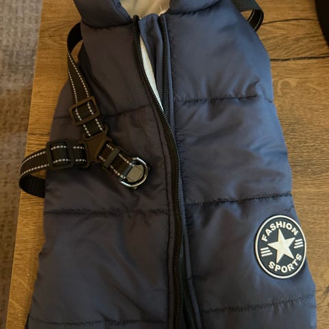 Dekken fra Fashion sports str. M. Brukt en kort periode til valp på ca 4-5 kg. Helt og pent og fungerer som det skal. Åpnes med praktisk glidelås i ryggen.