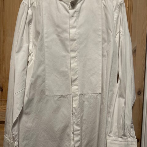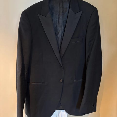 Smokingen er brukt en gang, ellers hunget pent i enn dresspose i skapet. Skjorta er av egyptisk bomull, ny pris 5500kr, selges hbo 3000,- følger med bukse, skjorte og dressjakke