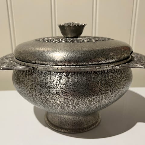 Pen liten stettskål i tinn med lokk. Merket Måstad Pewter Norway