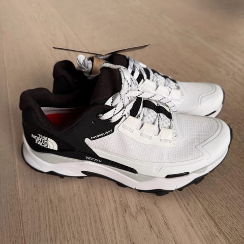 The North Face Women's Vectiv Exploris Mid fottursko i størrelse 40. Skoene er designet for fotturer og har en fargekombinasjon av hvit, svart og oransje. Modellen har en midtkutt design som gir ekstra støtte rundt ankelen.