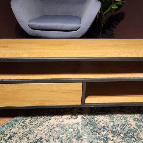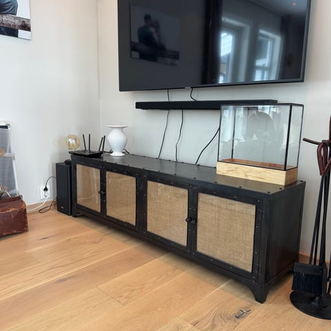 Meget pent og stilrent skap/skjenk i sort matt metall. Dører og side er av glass. Hyller er av metall. Den har en åpen hylle i bunn. Denne er kjøpt på Bohus, men kjenner ikke helt til modell eller annen info.
