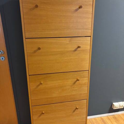 Selger dette skoskapet som fulgte med nytt hus. Den ene skuffen fungerte ikke da vi flyttet inn pga en knekt del, men denne delen fikk vi tak i ny på IKEA, så nå fungerer den. Merker at skuffen i midten berører stokken nedenfor (mild grad) når den åpnes, mulig det bare er å stramme et par skruer (eller få noen nye ekstradeler gratis på IKEA). Men det påvirker ikke bruken.