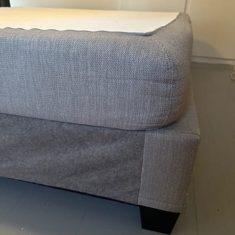 Bohus sengeramme og madrass. Sengerammen er i lyst tre med hvit front, og madrassen har et rutete mønster i blått og gult. Passer til enkeltseng. Madrass mål er 90x200. Tlf 45676673