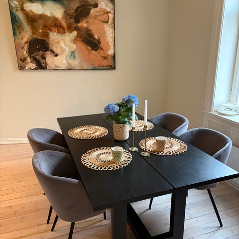 Stolene ble kjøpt for 1799,- per stol på Sofacompany. Her får du 4 stoler for 1000,-.