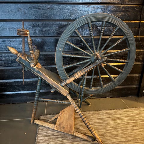Spinnrock i blått tre. Tradisjonelt verktøy brukt for spinning av fiber til garn. Har et stort hjul og flere spindler for trådproduksjon.