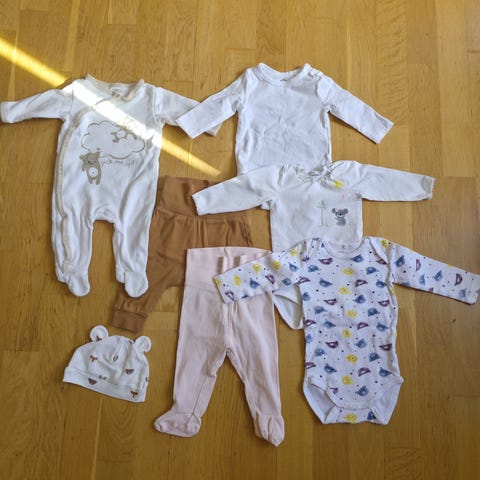 Nøytral klespakke i str 62. 4 omslagsbodyer, 2 pysjer og 3 bukser. Ene buksen har løsnet bittelitt fra sømmen bak, kan fikses. Se bilde. Zara, hm, Lindex